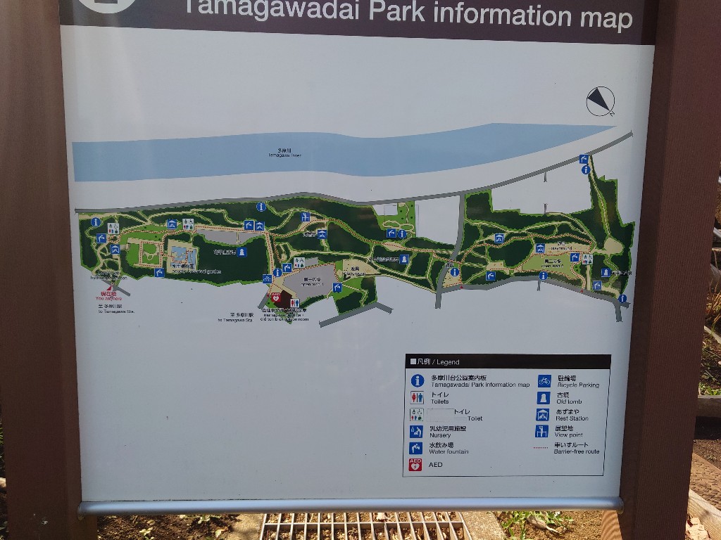 Passing through a residential area, I reached a long, narrow park along the Tamagawa River. This was my destination for the day: Tamagawadai Park.