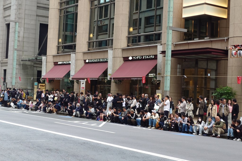 日本橋の目抜き通り沿いは見物客でごった返していた。 Along Nihonbashi’s main street, the crowds of spectators were even denser.