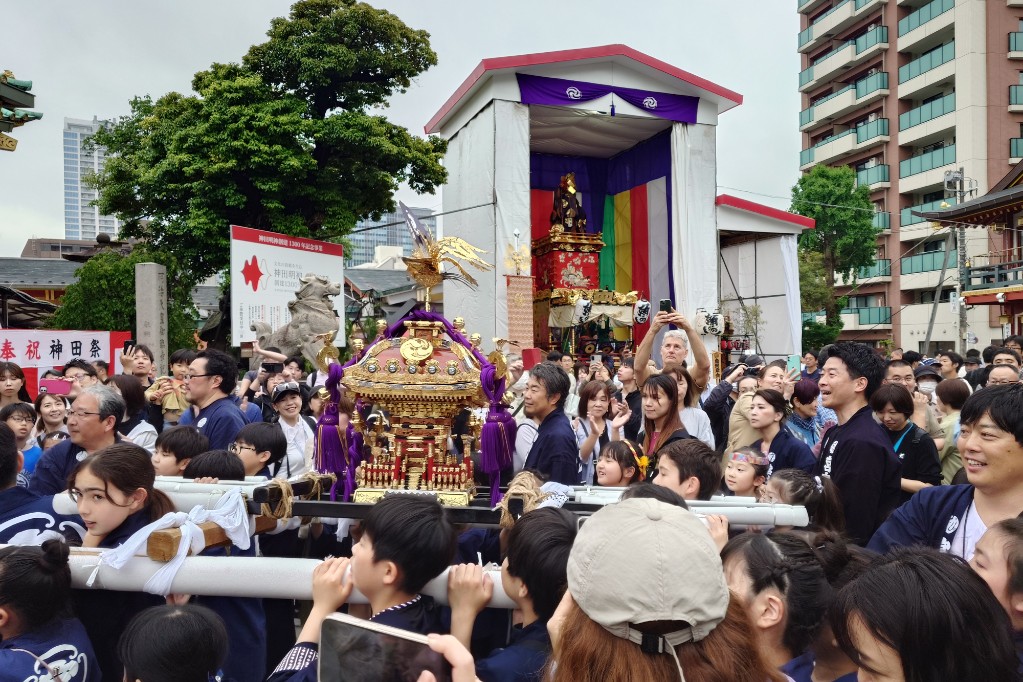 神幸祭とは、三柱の神が乗った鳳輦と神輿を中心とする絢爛豪華な大行列が、氏子の各町会を巡り、町々を祓い清める神田祭で最も注目される神事である。 The Shinkōsai is the highlight of the Kanda Festival: a lavish and colorful grand procession centered on hōren (phoenix palanquins) carrying the three enshrined deities, along with mikoshi. The parade tours all the local neighborhoods of the shrine’s parish, purifying each district as it goes.