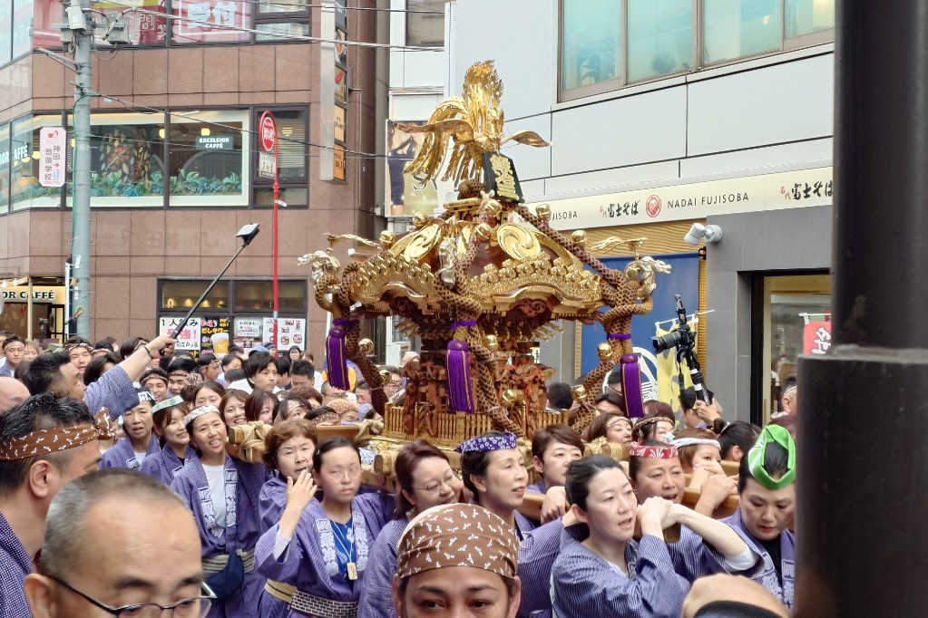 神幸祭のパレードを見ようと、日本橋まで歩く途中、女みこしに遭遇。 On my way toward Nihonbashi to watch the Shinkōsai Parade, I came across a lively women’s mikoshi (portable shrine) procession.