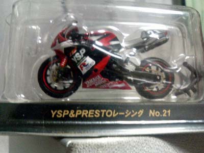 いやー、ようやくゲットしましたこのフィギュア!そう、サークルKで売ってる2005年の8耐参戦マシンフィギュアシリーズ!!思い起こせば2ヶ月くらい前でしょうか?!このフィギュアが出ることを知り「絶対YSPプレストレーシングのR1をゲットしてやる!」と誓い発売開始の7月末を心待ちにし実際にフライング気味の7月中旬から毎日のようにサークルKに行ってはフィギュアを探し、でも見つからずの繰り返し・・・そのうち八耐も終わり、その存在を忘れかけてきた8月頭にとうとう発見!とはいえやはり世の中うまくいかないようで毎日一個買っては違うバイク、また次の日買っては違うバイクの繰り返し・・・そうこうしてるうちにいつものサークルKでついに売り切れに!近くのサークルKに行っても既に手遅れで売り切れ状態!数軒探し回ってようやく見つけたので早速買ってみるもやはりまた違うバイク・・・とうとうそのお店でも今日寄ってみたらいよいよラスト4個となりしょうがない、こうなったらもう2個買うしかない!(注:残りの4個全部買ったらさすがに負けと思ったので・・・(;^_^A)ってことで右二つか左二つのどちらにしようかさんざん悩んだ挙句に結局真ん中二つをチョイスし急いで家に帰って恐る恐る箱を開けてみたら・・・おっ?!No.21だっ!よっしゃー!!(^^)vとりあえず最後の2個選ぶ際両サイド2つにしなくて良かったです、ハイ(^^ゞってことでこのR1をゲットするのに何個買ったはご想像にお任せします。ただ、一言言わせてもらうならばテレビの上がこのフィギュアシリーズで埋まっているのはいうまでもありません(;^_^A