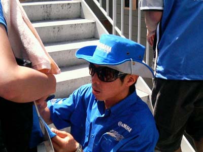 ってことでいよいよ決勝日である日曜日!今回は元祖YZTER君の力を借りて(元祖YZTER君ありがとう!そしてまたよろしく!!(;^_^A)パドックパスをゲット!(^^)v早速パドックに行ってみるといきなりハガノリ登場!!そうなんです、一緒に写真とったりサインしてたんですよね、フツーに。プロの連中なんてサインとかはサイン会のときしかしないもんだと思ってただけにへ~、こんな気さくな人だったんだぁ~(^^ゞと、T2Y的にポイント大幅UP!昨日のトップテントライアルの失敗も即水に流しちゃいました(;^_^Aちなみにぼくもその列に並ぼうと思ったんですが今回は(といっても8耐はいつもですが)スズキの応援団として行っているだけに全身スズキ(といってもヨシムラ)ファン状態。さすがにこれでは・・・泣く泣く諦めました(T_T)そうこうしているうちに今度はエドワーズ登場! 第一ライダーなだけにかなり集中してたんでしょうか?近寄ってくるなオーラがバリバリ出ててちょっとおっかなかったです(*_*)ってことでいよいよスタートが近づいたんで一旦観戦席に戻ってスタートを観戦!清成選手のホールショットで幕を明けいきなり1周目のS字でモリワキが転倒!続いてヘアピンで桜井ホンダの亀谷選手が転倒!今年も1周目から荒れてるなぁ~( ̄~ ̄)ζなーんて思ってるうちにトップの清成選手がコントロールラインを通過!そのとき既に2位集団を離しつつあるからびっくり!やはりやるなぁ~、清成!だてにBSBランキングトップじゃないな( ̄ー ̄)!って思いつつも2位集団を見たら・・・あれ?!エドワーズが・・・いないっ?!え"-!!!そうなんです、亀谷選手と絡んで転倒してたのはエドワーズ!いやいや、1周目からなにやってるのよ二人とも!!!その後清成選手に既に数ラップされてようやくエドワーズ選手コントロールライン通過~。ま、まだ始まったばっかりだし・・・なーんて思ってたら、今度はコース脇に青のR1をとめてるライダーの姿がモニター上に・・・。終わった・・・(T_T)ま、ツートップの一角は崩れたとはいえまだYSPプレストレーシングが残ってるわけだし!ってことでソッコーパドックパスを利用し2コーナー内側へGo!! はい、名前に一がつくトリオで決めさせていただきました(;^_^Aにしてもまぁ、やはり近くで見ると違いますね~、この迫力!!それに近いせいか指先の動作まで確認できるんでえ?!こんなところでブレーキ??いやいや、そこからもうアクセル開けちゃうの???と一人突っ込みの連発でした(;^_^A何よりこれらトップライダーはコーナーリングスピードが全然違い周回遅れとかもホントお構い無しでライン平気で変えてガンガン抜いちゃってるところを目の当たりにしただけに見てるこっちがおっかなくなっちゃいました。やはりプロの走りはいつ見ても参考になりませんね~(;^_^Aってことで2コーナー内側を堪能してしばし一休み。で、一休みといえばやはりこれ!伊勢名物?!赤福氷~♪これ名前のとおりで中に赤福はいってるんですよね(^^ゞ一年に一度しか会えないカキ氷なだけにひときわ美味しくいただきました♪そして気力も体力も復活して今度はシケイン~最終コーナーを偵察! なんかほのぼのした気分になりつつもいつかはここをこんな風に走り抜けたいなぁ~なーんて思うT2Yでした(;^_^Aで、いよいよ夕暮れも近づきライトON!再び観戦席に戻ってゴールを待ちました! 相変わらずナイトランは綺麗でしたね~♪ま、走る側は暗くて必死だと思いますが(;^_^Aってことで長かった8時間もいよいよ終わりを告げチェッカー!F.C.C. TSR ZIP-FM Racing Teamが初優勝!さらにはHONDA10連覇の偉業達成の瞬間でした!いやー、やはりレースっていいもんですね♪自分が走っても楽しいし、見ててもこんなに楽しいし!さらにはこんなにも大勢の人を感動させることもできる!ここのところいろいろあってこれからのバイクとの付き合い方について考えたりもしましたがやはり今後もバイクライフを楽しもう!そんなことを改めて思うことができた8耐でした。ってことで最後にこのブログをよく見てくれる皆さんへのお土産画像デス!まずはYAMAHA派な方へ!来年はぜひとも「ヤマハ・レッド・レーシング」として熱い情熱的な走りと共にリベンジ=優勝してもらいたいものですね!次にSUZUKI派な方へ! このライディングを身につければ、たとえ小柄な体でもトップライダーに?!そしてDUCATI派な方へ! 結果はイマイチでしたがその存在感は健在!デシタ!!そしてKAWASAKI派な方へ! 来年こそは参戦して優勝を!ってところでしょうか(^^ゞ最後にHONDA・・・いやDUNLOPERな方へ! こんなオチでよろしかったでしょうか?(;^_^Aってことで今回もいろいろ写真取りまくりな8耐でしたがT2Y的ベストショットはこれ! とりあえずレース的にはHONDAが優勝しましたがクィーン的にはSUZUKIが優勝でした♪おあとがよろしいようで・・・(;^_^A