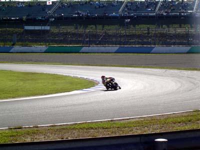 ってことで先週末、とうとうロードレース最高峰・MotoGPを観戦しちゃいました!今まで全日本モトクロス、8耐、全日本ロードレース等々いろいろ見てきましたが今回ばかりはホント参りました!MotoGPすごすぎデスっ!ちょっと言葉は古いですが、想定の範囲外!!今まで何で見に行かなかったんだろう??と思ってしまうほどいい経験させてもらいました(^^ゞってことで恒例の?!画像と共に振り返るMotoGP、どうぞご覧ください~(;^_^A1日目(9月23日)朝3時集合でいきなりちょっとしたハプニングがありつつも1時間遅れの4時には出発!永遠高速を北上し・・・ 9時頃ですかね?ようやく到着~(^^)vそしてソッコーサイン会の抽選会場に並んでるとブロ友(=ブログ友達の略・笑)のAYAさんからメールが!なんでも同じ列にならんでるらしく服装は白い上着で中はヤマハのシャツでジーンズで・・・とのこと。いやいや、さすがにこれだけの情報じゃわかんないでしょ~だってあそこに座ってる女の子もそうだし~・・・えっ?!えーーーっ!もしかして??心の準備ができてない状態でご対面だったんで久しぶりに固まってしまいました(;^_^Aってことでここで運を使い果たしてしまったせいか?!サイン会の抽選は見事にはずれ~(T_T)しかもその行列に並んでたため時間をくってしまいMotoGPのフリー走行も残り5分のみの観戦!早速観戦席に行きましたがその爆音に思わず笑っちゃいました(≧∀≦)いやいやマフラー意味ないじゃん!!とりあえずしばらく観戦席で見てましたがオーバルコース上のアリーナ席に降りれることがわかり早速そこへGo!もっと近くでその爆音を堪能しちゃいました♪そうこうしてるうちにフリー走行終了~。何気に今ってオーバルコースにいるんだよなぁ~とあらためて思って記念撮影☆ そしてお昼は中野"NINJA"寿司!これを目指して一旦外へ出ようと思ったんですがちょうどNGKブースでじゃんけん大会が始まったんでついつい参加(;^_^Aま、当然勝ち残れるわけもなく、ぼちぼちバス停に向かって和食処 登谷へGo!開店時間の11時半ちょっと前に到着するも既に結構な人数の行列が!!限定30食だし・・・これはもう無理だね・・・(T_T)中には諦めて帰る客もちらほらいたんですがぼくらはせっかくここまできたしお店自体は落ち着いた感じでよかったんでとりあえずここで御飯を食べてくことにしました。そして待つこと45分。ようやく前の客二人に続いてお店に入りましたが入ってみてびっくり!なんと中野Ninja寿司、その前の客二人がぎりぎりOUT!!そうなんです、じゃんけん大会やってなかったら食べれたんですNINJA寿司!!ま、まじっすか~・・・大の大人四人がマジでがっかりした瞬間でした(*_*)ただその代わりに食べた海鮮丼、安いしかなり美味しかったんでこれはこれでありだったんですけどね(;^_^Aそして午後は気を取り直して予選観戦!早速パドックパスって中に入ってお目当てロッシの控え室前にGo!既に出てくるところを見ようとこれまた大行列ができてたんでしょうがない、その行列に並んでたんですがふと後ろを見たらそこには! 8耐でもみかけたエドワーズ登場!いやいやこのタイミングでこられても場所離れるわけにはいかないからサインもらえないじゃん!!結局この写真をとって我慢。そのかわりロッシが出てくるのを待つこと数分。いわゆるSP(といってもヤマハ関係者ですが)に囲まれロッシ登場!よしっ!写真写真!え?あれ?カ、カメラが・・・(*_*)こんな時に限ってカメラ操作を間違えたらしく前々うまく撮れないっ!とりあえずシャッター押しまくった結果がこれデス。 超マニアックなロッシののど仏を撮影~(>____