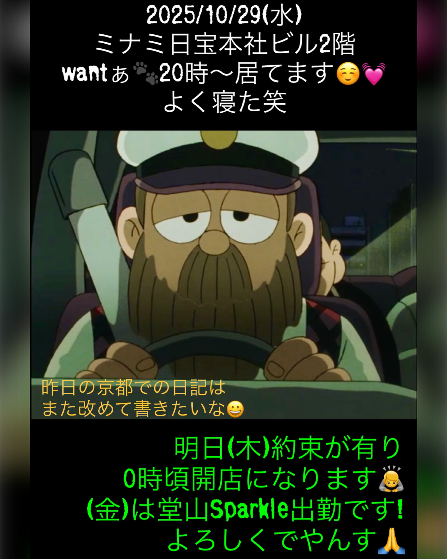 (⚫️)′ `・){2025/10/29(水)「経験は残酷な教師だが、人を大きく成長させてくれる」C・S・ルイス昨日はやはり折角の京都、友達に色んなお店案内してもろて朝まで🍻昼前帰阪で体調も崩さず気持ち良く爆睡😴(木)約束が有り0時開店の予定🙏(金)堂山Sparkle✌️【wantぁ12年と3ヶ月10月もどうかご贔屓に🤲】#大阪ミナミ 🐾【 #wantぁ 】🐾#起きてる時間が営業時間 #日宝本社ビル 2階🏢#堂山 #ニューハーフ #パンセク✨ミックスバー【Sparkle】✨主に(金)👶ママ誕生日月間👏🐼#必ず電話📲 #たぁぽん酢#ミックスバー wantぁ #ミナミの住人と繋がりたい #京都飲み #祇園バー #笑ゥせぇるすまん #LGBT #ftm #中性 #ゲイバー #ビアンバー#おなべバー #パートナー募集 笑#アルコールアスリート #バイセクシャル#飲み飲ませ#ボトルキープあり #遅くまで飲めます#看板消えてても中に居てたりします#電子マネークレカPayPayいけます#ぽん酢サワーの飲める店#ずんだもん👶🍺💨💨😎🔪💨差し入れは煙草で整形費手術費店の改装費カンパして笑ビール酎ハイ焼酎シャンパン飲みたい