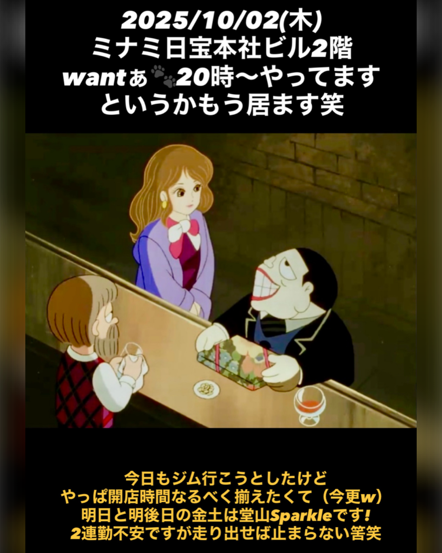 (⚫️)′ `・){2025/10/03(金)「超自然界における邪悪な存在の中で、一番タチの悪いものはヴァンパイア。悪魔の中でも最悪の存在である」モンタギュー・サマーズ何年も同じ様なセットをしてる筋トレ💪ちょっと日にち空いたら筋肉痛えぐくてまた発熱しそうだわ🔥今週金土は堂山Sparkleなので動向はストーリーにて🙇【ママ誕生日🤫】【wantぁ12年と3ヶ月10月もどうかご贔屓に🤲】#大阪ミナミ 🐾【 #wantぁ 】🐾#起きてる時間が営業時間 #日宝本社ビル 2階🏢#堂山 #ニューハーフ #パンセク✨ミックスバー【Sparkle】✨たまに助っ人🎵🐼#必ず電話📲 #たぁぽん酢#ミックスバー wantぁ #ミナミの住人と繋がりたい #あり酢ママ誕生日 #毎日がイベント #LGBT #ftm #中性 #ゲイバー #ビアンバー#おなべバー #パートナー募集 笑#アルコールアスリート #バイセクシャル#飲み放題あり #ピッチャーあり#ボトルキープあり #遅くまで飲めます#看板消えてても中に居てたりします#電子マネークレカPayPayいけます#ぽん酢サワーの飲める店#ずんだもん👶🍺💨💨😎🔪💨差し入れは煙草で整形費手術費店の改装費カンパして笑ビール酎ハイ焼酎シャンパン飲みたい