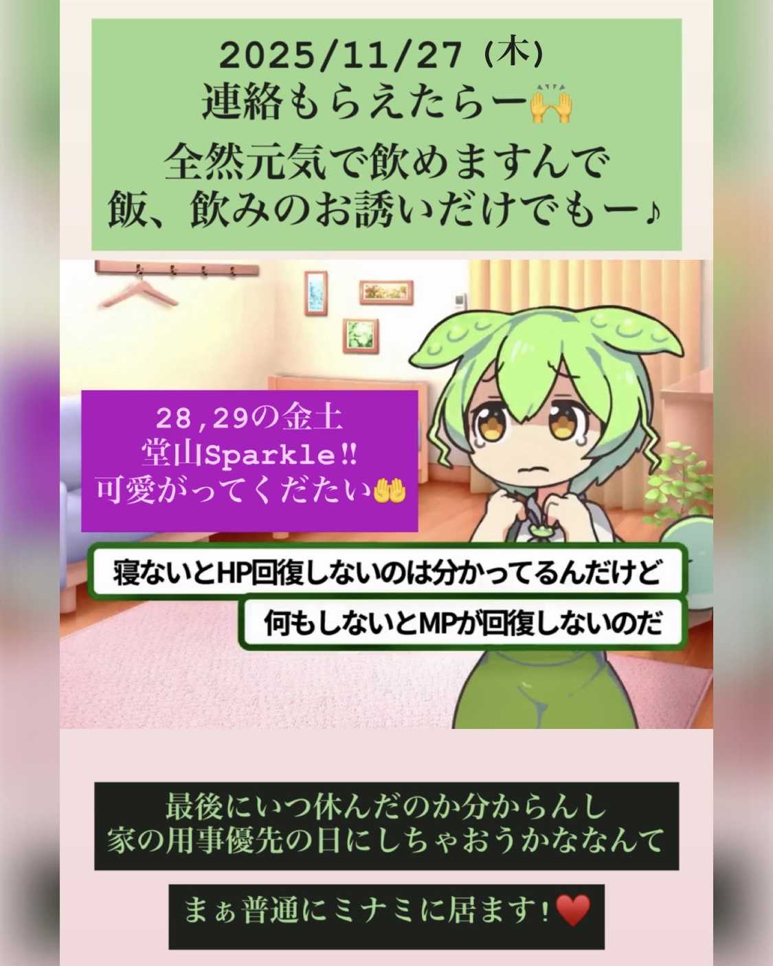 昨日は堂山でもミナミでもありがとうございました🙏大好きなお客様ばかりで幸せでした😣結構寝てだいぶ落ち着きましたがやっぱ栄養と睡眠ちゃんと摂りたいですね💦鍋とか誘ってください笑店には居ますがゆっくりしてますんで先に連絡お願いします🙇