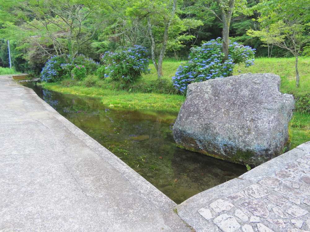 竹田湧水群の一つ。名水百選に選定されている。塩井湧水と鳴滝の2つからなり、塩井湧水の湧水量は1日5760t、鳴滝の湧水量は1日960t。竹田湧水群の中では最も自然が残された状態となっている。塩井湧水は集落の少しはずれに位置する水源地で、湧水は主に農業用水として使われており、付近に広がる水田では湧水を用いた名水米が栽培されている。鳴滝は鳴滝神社の境内にある水源地で民家の間の細道を通った先にあり、白水の滝に近い形で岩の隙間から湧き出た岩清水が滝となって流れ落ちており、湧水は農業用水や水道水として利用されている。湧水で不治の病が治ったという伝えが残っており、滝の中段には祠が祀られている。塩井湧水には駐車場があり、水汲み場も設けられている。集落の田園のあぜ道を通っていく必要があるので車の運転には注意。塩井湧水。駐車場の前には水源地から流れた水が溜まってできた小さな池がある。ここから塩井水路を通じて湧水が流れていき、周辺の田畑を潤している。初夏にはホタルが見れるそう。塩井湧水に咲いていたアジサイの花。水汲み場。駐車場のすぐ近くにある。円形となっていて四方に汲み口がある。駐車場から更に30m進んだところに、塩井湧水の水源地がある。塩井湧水水源地。岩の隙間からこんこんと、絶え間なく水が湧いている。こちらにも水汲み用に柄杓が置いてある。水源地から駐車場近くの池へと続く小川。水面は水中の水草を揺らしながら静かに揺れていて、水は底の砂地が見えるほど綺麗に透き通っている。水際に生える緑もまた美しい。塩井水源から車で4分ほどの場所に鳴滝がある。こちらには駐車場がないので、道脇の邪魔にならないところに停める。鳴滝神社鳥居。1906年(明治39年)に造られたもの。しばらく歩くと鳴滝に到着。鳴滝。ほとんど人の手が入っていないありのままの自然を残した水源で、どこか神秘的な雰囲気。近づくとひんやりとして涼しい。一見すると滝そのものだが川に懸かってはおらず、実際には岩壁の亀裂から水が湧き出ており何条かの流れを作っている。滝の中段に祀られている祠。よく見ると滝の上段からも微かに水が流れ落ちている。滝の前にある賽銭箱。岩肌を伝って流れ落ちていく鳴滝の岩清水。柱状節理の立派な岩肌。鳴滝から流れた水はそのまま周辺の田園へと流れていっている。竹田の湧水で育ったお米は「名水たけた米」の銘柄で販売されており、美味しい名水米として評価が高い。↓ランキング参加中。この記事が良いと思った方はクリックしてねにほんブログ村