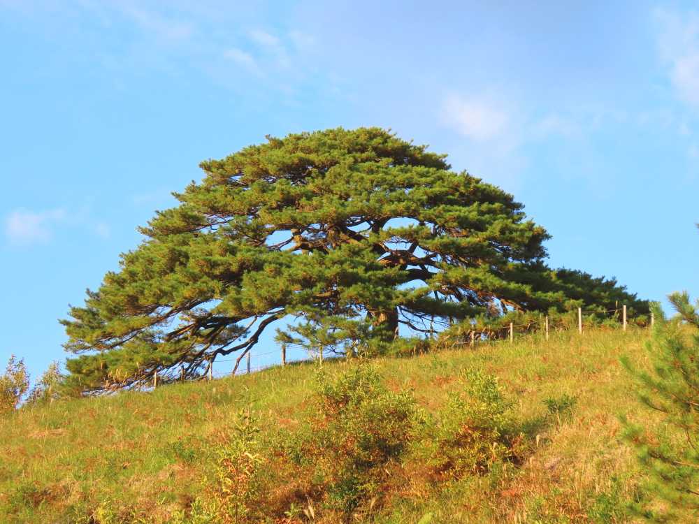 池尻集落の小高い丘の上に立つ、アカマツの巨樹。県指定天然記念物に指定されている。樹高約8m、幹囲約3.4m、枝張りは東西約24m、南北約20m、推定樹齢は350年以上。樹冠(木の上部、枝や葉が集まる部分)が傘を広げたように見事な広がりを見せており、それが名前の由来になっている。人の手は入っておらず、地質、日光、水環境などの好条件が重なり、自然にこの造形を作り上げたという。かつては50m程離れた位置にクロマツがあり、それと共に「夫婦松」と呼ばれていた。付近に駐車場があるが、そこまでの道がかなり狭いので注意。竜宮滝がある場所から案内板があるので、それに従って進んでいくと田畑の広がる集落へたどり着き、小高い丘の上に1本の大きな松が見える。これが唐傘松。丘の上に1本の松が立つその姿は、まるで天然の盆栽といったところ。駐車場までは行けそうになかったので、邪魔にならない場所に車を停めて近くまで。近くで見た唐傘松。地元住民の方々によって大切に管理されているといい、木の周辺には柵が設けられている。樹冠の部分。地面を雨で濡らすまいと、傘を広げる様にして大きく枝が広がっており、葉も沢山付けている。雄姿と共に、和傘のような優美さも感じられる。長く伸びた枝はなだらかな斜面に平行するように伸びており、絶妙なバランスを保っている。人が造形したものでなく、自然とこうした形になっているのは見事としか言いようがない。枝に沢山付いた松ぼっくり。幹。大きな枝張りを持つ唐傘松を長年にわたって支え続けており、上部は無数の太い枝が絡み合うようになっている。松のそばにある歌碑。唐傘松の周辺にもいくつかの松の木がある。兄弟の木なのだろうか?↓ランキング参加中。この記事が良いと思った方はクリックしてねにほんブログ村