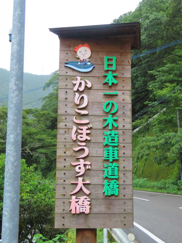 一ツ瀬川に架かる、日本一の木造車道橋。木造で単純桁橋と3つのキングポストトラス橋を組み合わせた構造となっている。橋長140m、支間長は14.3m、48.2m、48.2m、23.2m、幅員7.0m。車道は2車線となっており、大型車両も通れるようになっている。木造車道橋としては、日本一の長さを誇る。キングポストトラスとなっている3つの大きな三角形の形状が特徴的で、これは米良三山(市房山、石堂山、天包山)をイメージしたもの。橋の名前にもなっている「かりこぼうず」というのは、米良地方に古くから伝わっている守り神だそうで、西米良村のマスコットキャラクターとしても知られている。橋は宮崎県産スギ材の需要拡大を目的に、ふるさと林道緊急整備事業として架橋が開始。約6000本の樹齢50年以上のスギ丸太を、集成材にして加工して建設され、2000年(平成12年)から2002年(平成14年)にかけて造られた。橋のすぐ近くには川の駅「百菜屋」があり、西米良村の特産品やお土産の販売の他に食事処もある。また、国道219号線側から橋を渡り1km進んだ先には温泉施設「西米良温泉 カリコボーズの湯 ゆた~と」がある。日本一の木造車道橋 かりこぼうず大橋の看板。川の駅 百菜屋近くの展望台から見たかりこぼうず大橋。だいぶ近くで見れるようになっていて橋もかなり大きく、ここからじゃ写真1枚に収まりきれない。かりこぼうず大橋トラス下弦材の実物大見本。高さは183cm。キングポストトラスとなっている3つの大きな三角形。米良三山こと市房山、石堂山、天包山をイメージしたもので、まさしく西米良村を象徴するデザインとなっている。2、3枚目のトラスは同じ高さで24.1m、1枚目の最も小さなトラスは11.6m。山の高さからして、国道219号線側から見て奥から市房山、石堂山、天包山といったところだろうか。欄干に描かれているかりこぼうず。「カリコボーズ」と記されることもある。前述の通り米良地方に伝わる守り神で、西米良村のマスコットキャラクターともなっており村のホームページや観光名所の各地でしばしば目にする。どうやら着ぐるみまで作られているそう。なお、かりこぼうずという名前の由来は、山で猟をするときに動物を追い出したり射手のいるところに追い込む役目をする「狩子」からきているそう。車道。2車線で大型車両も通れる。完全な車道橋となっていて歩道はない。川の駅 百菜屋の近くに川の方へと下りる階段が伸びており、そこから橋の下に行けるようになっている。橋のすぐ下にはマイクロ水力発電装置が設けられていて、発電した電気は百菜屋の照明や時計などに使われている。下から見たかりこぼうず大橋。横からだとコンクリートの支柱や金属板が目立つので木造だと分かりにくいが、こうして見ると木材で支えられていることがはっきりと分かる。橋の下を流れる一ツ瀬川。宮崎県中部を流れる川で、西米良村の流域は透明度が非常に高く、エメラルドグリーンに輝いて見える。訪れた時は雨の影響で少し増水していた。また、川は渓流釣りの名所で、ヤマメやアユが釣れる。ここに来るまでの道中でも、雨でありながら川に入って釣りをする人が結構いた。開通記念碑。橋を渡った先にある東屋と橋の概要が記された看板。看板はかりこぼうず大橋と同じ宮崎県産のスギが用いられていて、造りも橋の一部と同じになっており、各部に橋の構造についての説明が書かれている。少し川を下った場所から見たかりこぼうず大橋。↓ランキング参加中。この記事が良いと思った方はクリックしてねにほんブログ村