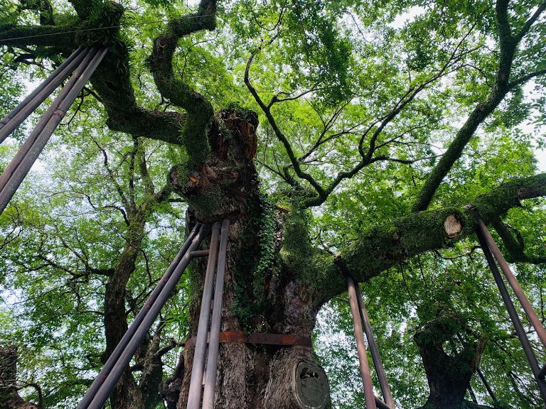 御所通りの菊池高校正門のすぐ脇に立つ、巨大な椋(ムク)の木。熊本県の天然記念物に指定されている。