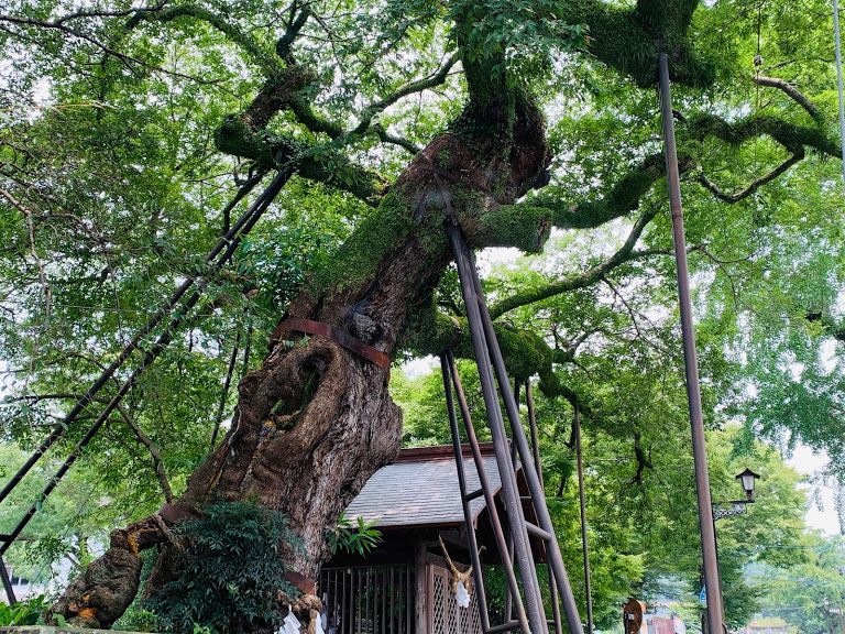 将軍木。右側にあるのは頓宮。懐良親王が祀られている。