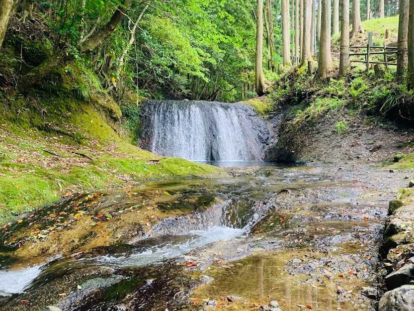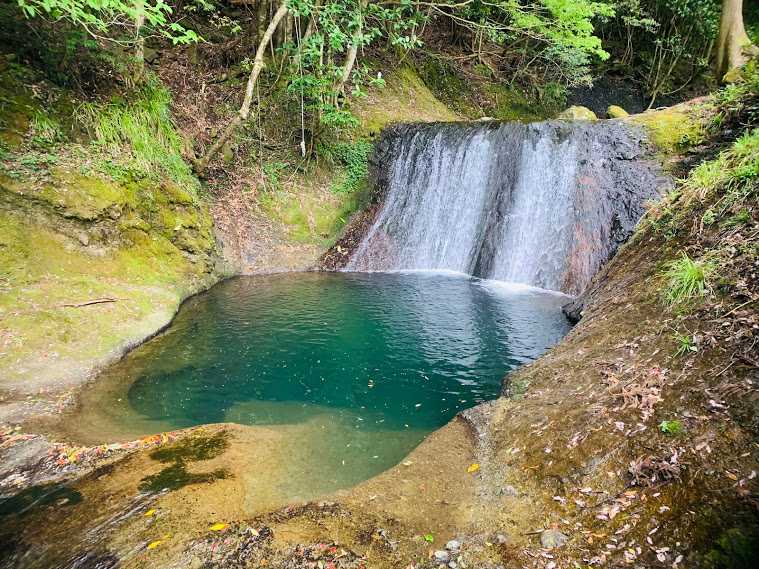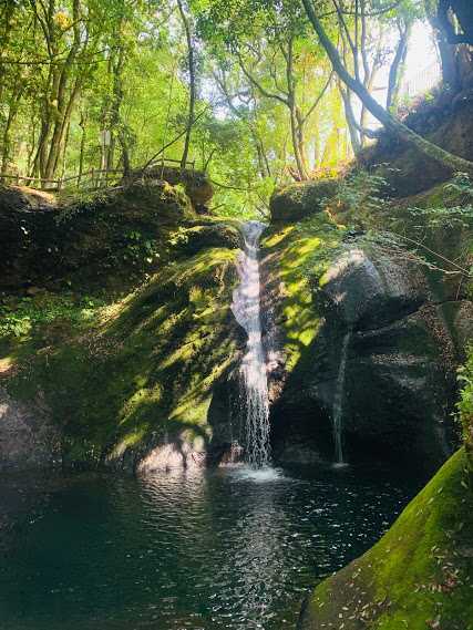 ​​秡川の源流部にあり、福岡県森林浴100選に選ばれた自然豊かなキャンプ場、じゃぶち森のビレッジ(旧蛇渕キャンプ場)内にある滝。