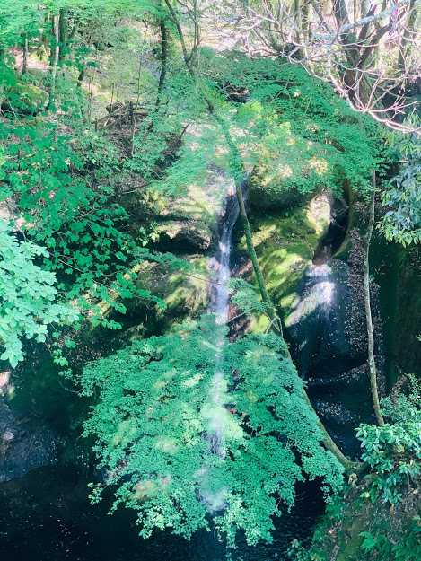 滝見台から見た蛇渕の滝。 の生い茂る岩の間を、深い青の滝壺に向かってさらさらと水が流れ落ちていく。