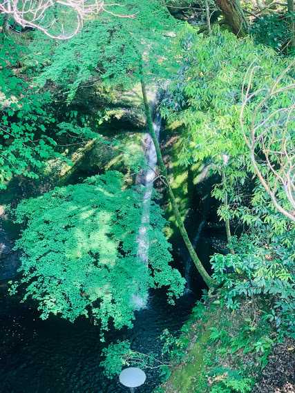 龍神橋の上から見た蛇渕の滝。 青もみじ 越しに滝を見る。