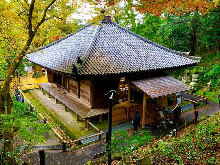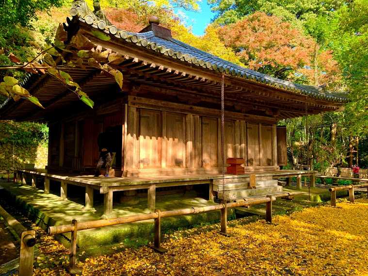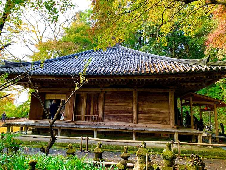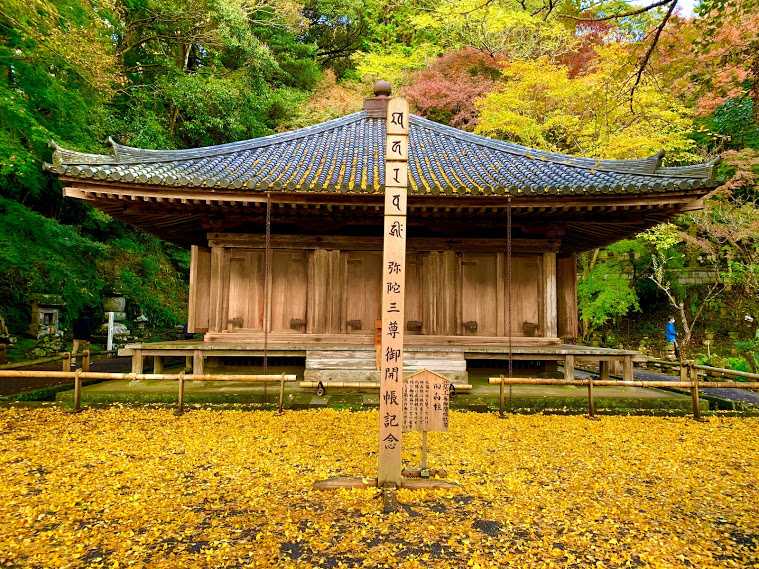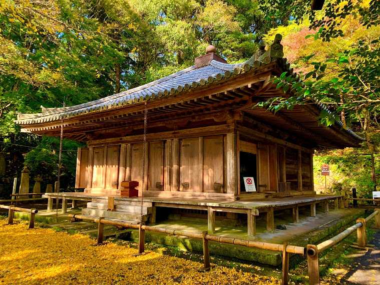 富貴寺大堂。小規模の建築であるが、国宝に指定された九州最古の木造建築。1枚目の大堂の手前に立っている柱は「回向柱」。 仏様の手と繋がっており、柱に触れることで仏様に直接触れるのと同じ御利益があるという。