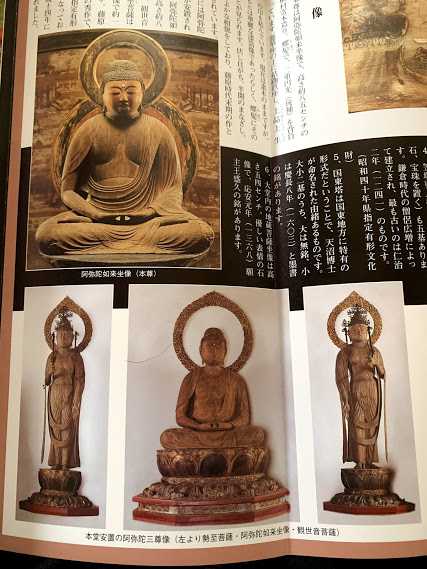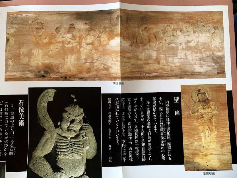 大堂に描かれている壁画と、本堂安置の阿弥陀三尊像(パンフレットより)。 どちらも国指定重要文化財に指定されている貴重な文化財。