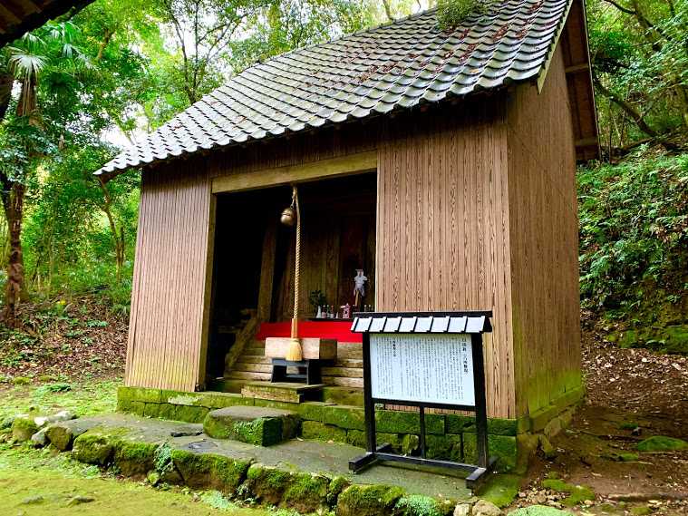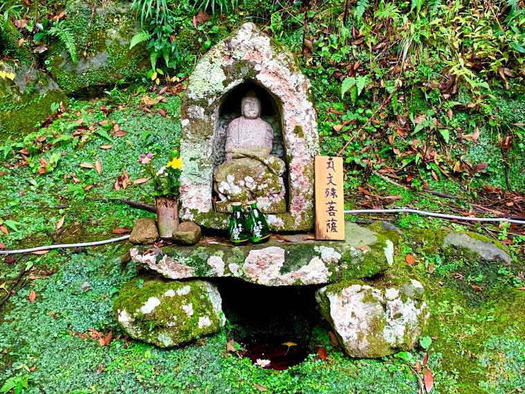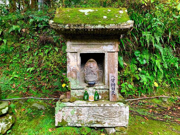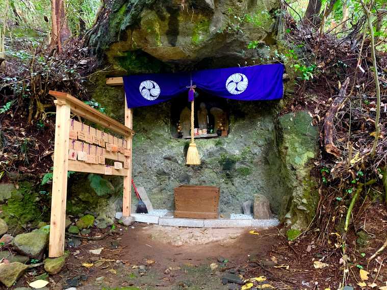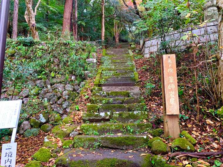 奥の院、薬師岩屋。自然の岩を削り、石造りの薬師如来を安置されている。