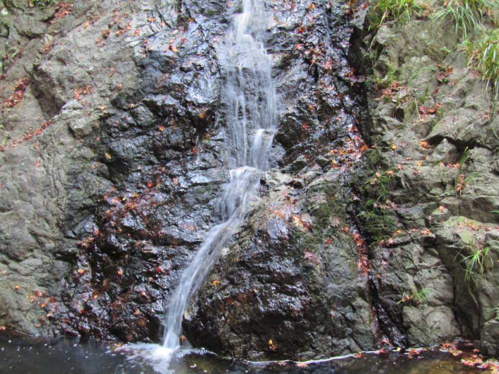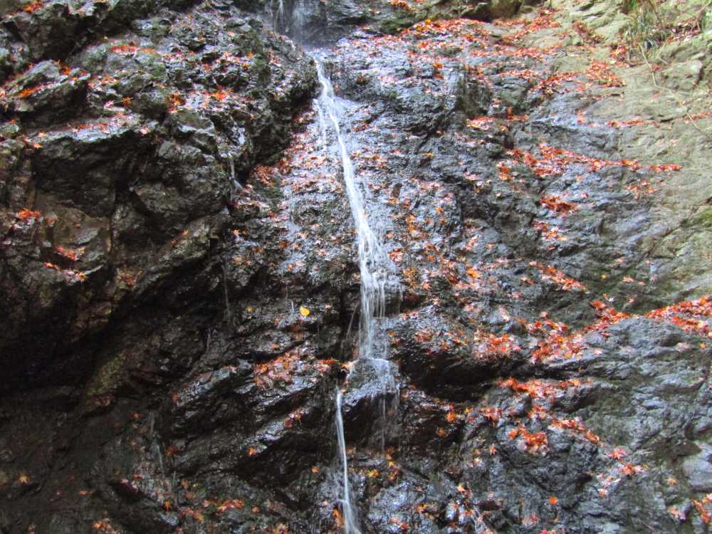 白馬渓で一番大きな滝。 水量は少なく、大きな岩に1本の白い糸がかかるようにして流れ落ちている。 岩には落葉がかかっていた。水は…お世辞にも綺麗とはいえない。