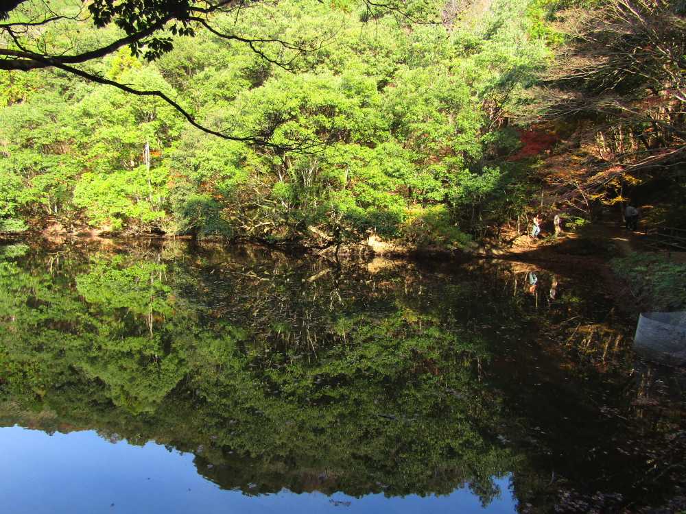 大神宮から更に登った場所にある池。 水面は波一つ立てず綺麗な水鏡となっており、木々や青空を映し出している。