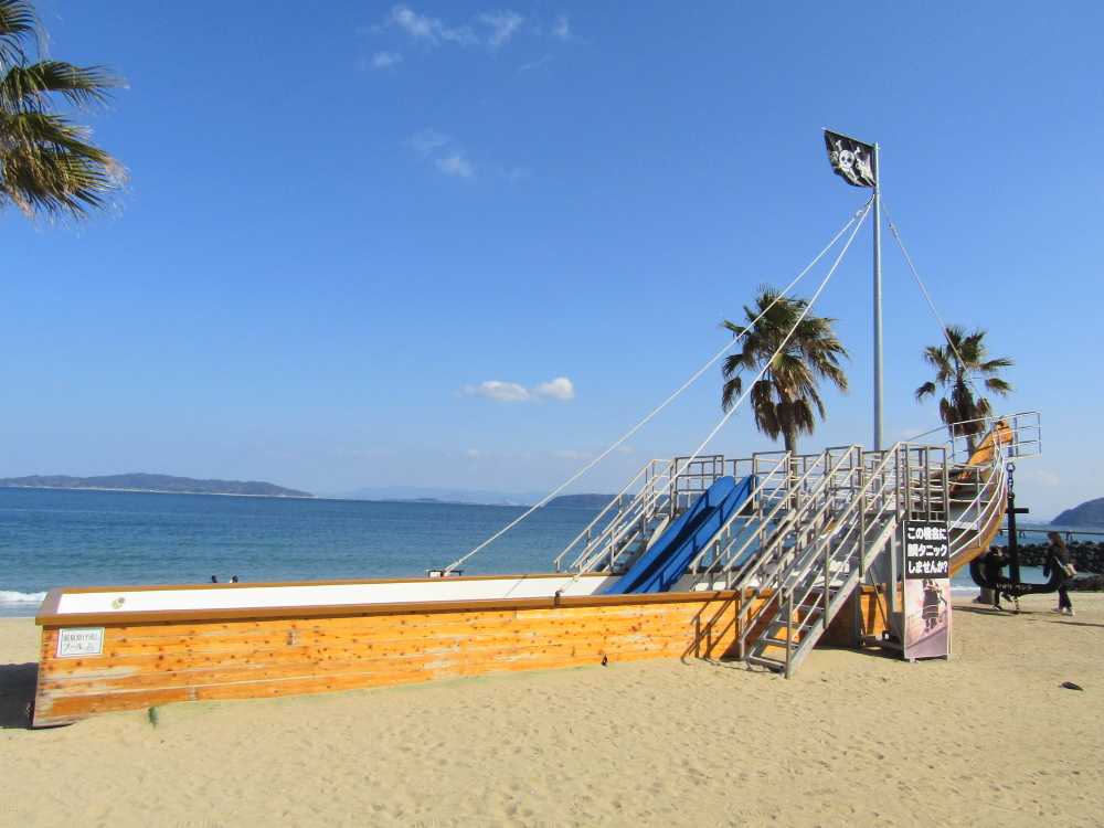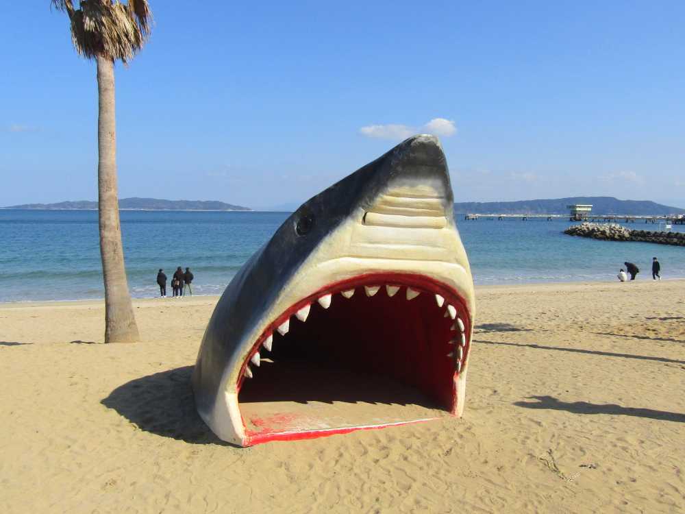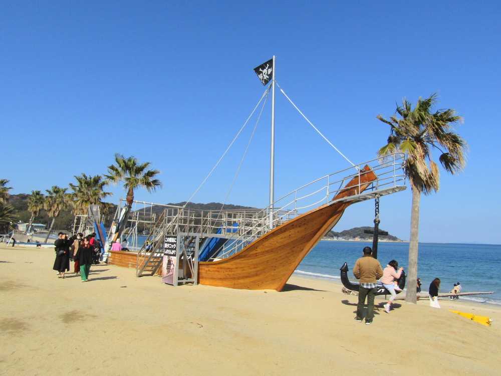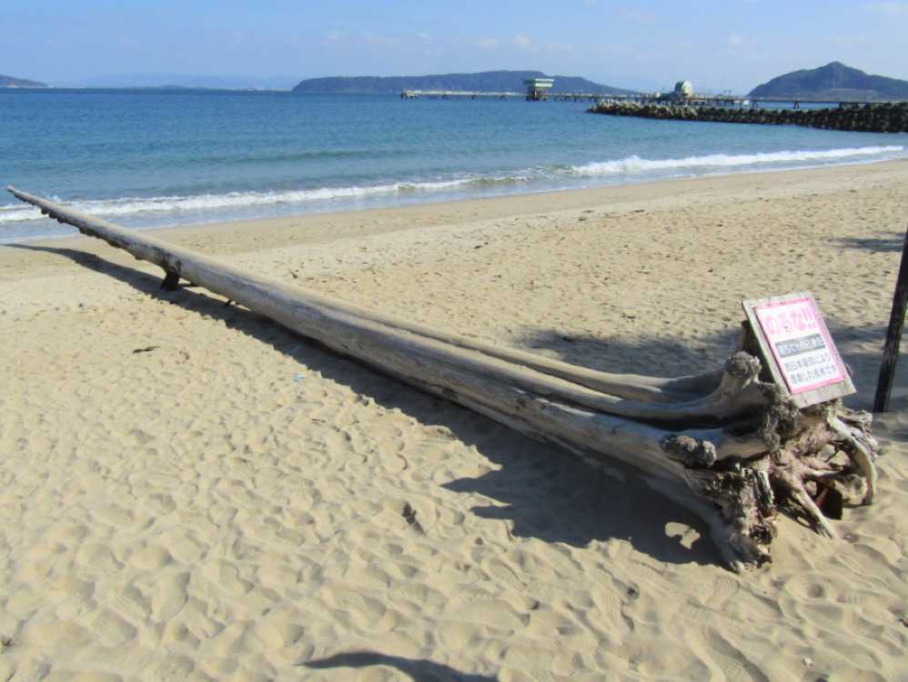 奇石の流木。 2018年(平成30年)に発生した西日本豪雨により、この海岸に漂着した流木。 濁流の川を渡って海に漂流し、船などにも衝突せず、これほどの形を残して流れ着いたことからこう呼ばれている。上に乗って写真を撮る人もいるが…落ちても自己責任とされている。