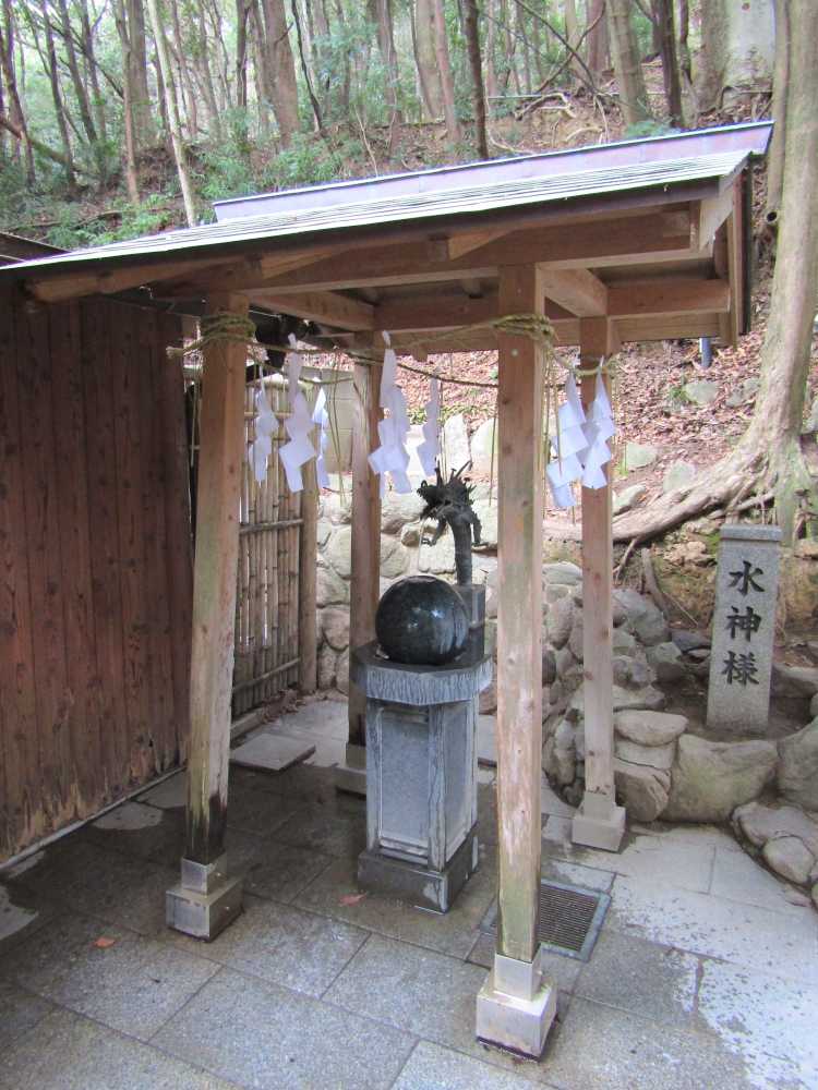 七番社・水神社。宮地嶽周辺には大河がなく、ここに龍神様が差配され、水枯れすることなく今なおこんこんと水が湧き出ている。宮地嶽周辺の農家は水を大切に扱ってきたといい、大飢饉の時代も年貢米を返上することなく完納し、他藩の模範として表彰されたこともあるという。 このような水に対する思いや信仰が、この水神社に込められている。