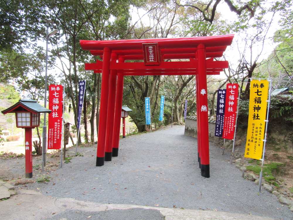 一番社・七福神社。入り口の鳥居をくぐって参道を進んで右手に鎮座する。恵比寿・大黒天・毘沙門天・弁財天・福禄寿・寿老人・布袋の七福神を祀り、 福を運ぶ神様として、様々な御利益が得られる。