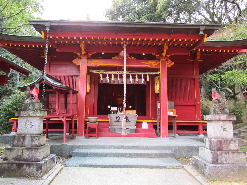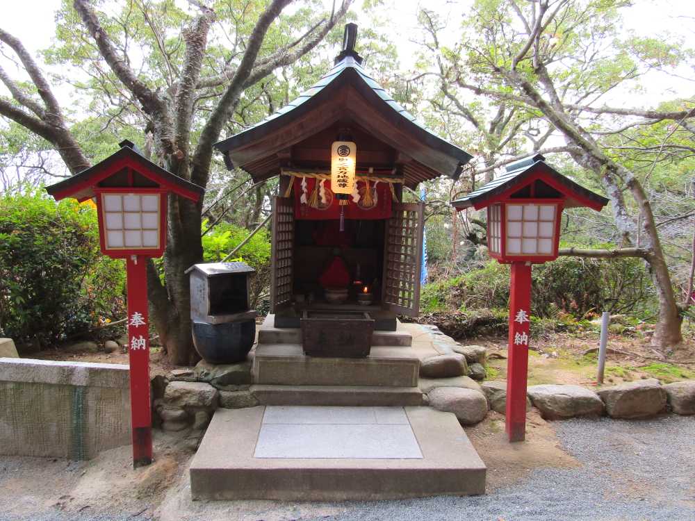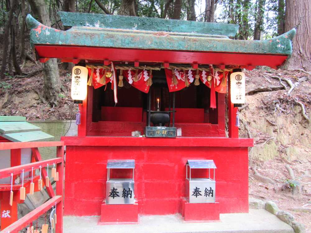五番社・恋の宮(淡島神社、濡髪大明神)。女性の体をお守りするあわしま様と、心をお守りするぬれがみ様を併せ祀る。共に女性の心身内外をお守りする神様で、恋の宮と称される。 女性特有の体の病や恋愛に霊感あらたかだとされている。