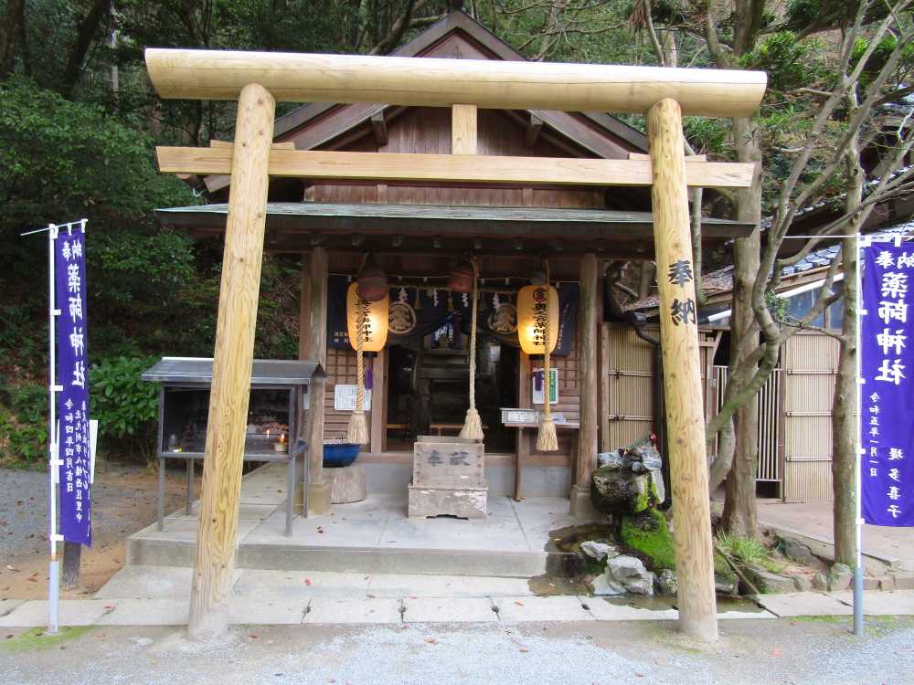 八番社・薬師神社。修験者が宮地嶽の山中で修行をする際、病気や怪我がないようにと、薬師様を祀ったのが始まりだと言われている。 あらゆる難病から救う神様として信仰が強い。 苔が生した石の手水鉢があり、6月になると花手水が作られている。