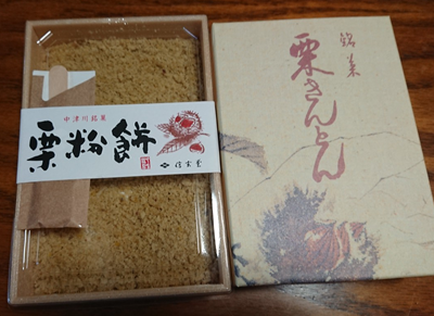 今年もいただきました少し前のことですが、岐阜の中津川に住む義姉夫婦が来ていて、お土産に秋の味覚を持ってきてくれました。岐阜中津川の銘菓、「栗きんとん」です。来れないときは送ってくれたりして、毎年ご馳走になっています。今年は「栗きんとん」の他に、「栗粉餅」も。「栗粉餅」、我が家初めて食べました。柔らかいお餅に栗きんとんを粉にしたものがたくさんかかっていて、粉をたっぷりとつけながら食べるお餅が柔らかくて美味しい~。そして、栗きんとん。川上屋の栗きんとんは有名ですね。ホクホクでほんのり甘くて、すごく美味しいです。これを食べると秋を感じますね。
