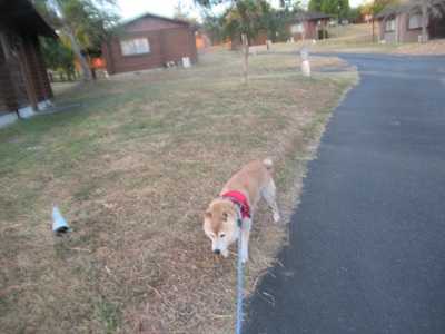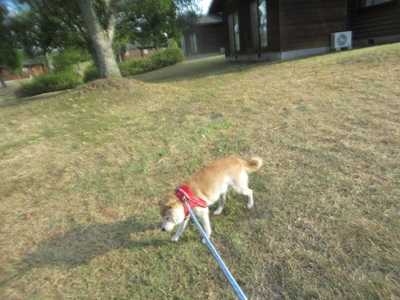 朝散歩へ旅行記の続きです。2日目の朝です。ゴンの朝散歩へ。コテージ街をお散歩です。広い芝生のところへ。ちょうど日の出の時間でした。この時は暑い時期で、日が照ってくると一気に暑くなります。お散歩続行。日の出をバックに。芝生の奥から昇りだします。日陰の方へ。広い芝生で、誰もいないので、ちょっとリードを離してみました。ゴンはもう最近はドッグランに行っても、走らずにウロウロするだけなので、こういうところでもウロウロするだけかな、と。今までだったらどこに飛んでいくかわからなかったんだけどね。案の定ウロウロするだけでした。そろそろコテージに戻ろうか?日も照ってきたし。こちらはコテージというより貸別荘風。ちょっと長いお散歩でした。旅行記は今日はここまで。明日に続きます。