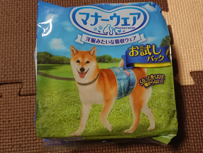 マナーウェア先日、マナーウェアを初めて買ってみました。ゴンは基本的に室内ではオシッコはしないのですが、最近はお散歩も嫌々モードになることがあるし、お散歩していても途中で座り込んでしまうこともありました。このままではいつお散歩に行けなくなることがあるかもしれない、と、マナーウエアを準備しておくことに。とりあえずお試しパックを買ってみました。でもゴンは着けさせてくれるかな?着けてみました。意外と簡単で、腰に巻いてテープにくっつけるだけ。こんな感じです。もしお散歩行かないときはこれを着けないとね。