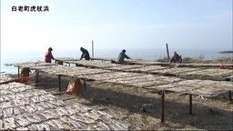 (2020/3/22 UHB北海道文化放送 北海道ニュース「春の潮風と陽光を浴びて スケソウダラのすき身干し作業本番 白老町」より:https://uhb.jp/news/single.html?id=11510)