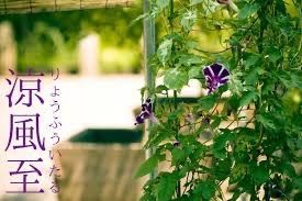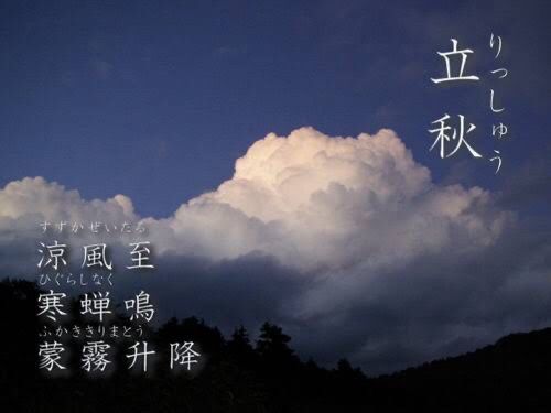 次候 寒蝉鳴(ひぐらしなく): 蜩が鳴き始める(日本) 白露降(はくろ くだる): 朝露が降り始める(中国)末候 蒙霧升降(ふかききりまとう): 深い霧が立ち込める(日本)寒蝉鳴(ひぐらしなく): 蜩が鳴き始める(中国)(ウィキペディア「立秋」より: https://ja.m.wikipedia.org/wiki/%E7%AB%8B%E7%A7%8B )