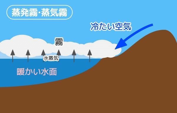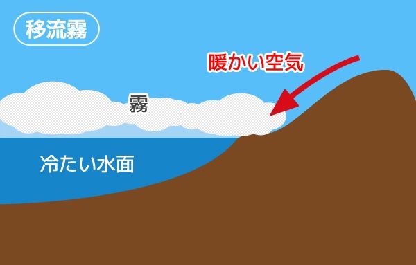 ​​ ・移流霧: 暖かく湿った空気が水温の低い海上や陸地に接する事で冷やされ、大気中に含まれる水蒸気が霧として排出される。
