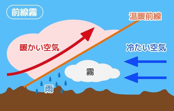 ​​ ・前線霧: 暖かい空気と冷たい空気が接する前線付近で、暖かい空気が冷やされて発生する霧。