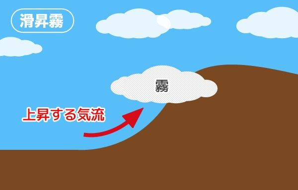 ・上昇霧: ​​ 山の斜面を暖かく湿った空気が這い上がり、高度が上がるにつれ徐々に冷やされ、露点に達した地点で発生する霧。遠くから見ると山に掛かった雲に見えるが、継続的に暖かい空気が上昇している場合などは次々と霧が発生し、晴れ難い霧とも言える。