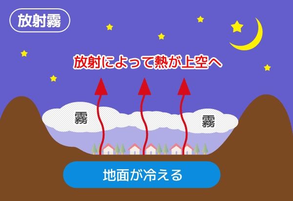 ​​ ・放射霧: 夜になり、地表面から熱が放射され地面が冷えると、地面に近い空気も冷やされ、大気中に含まれる水蒸気が霧として排出される。
