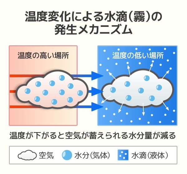 霧の発生メカニズムは、空気中に気体として蓄えられる水分量は暖かいほど多く、温度が低くなると少なくなり(飽和水蒸気量)、水分量を多く含む暖かい空気が何らかの理由で冷やされると、水蒸気(気体)が水粒(液体)となり、空中に浮かんだ"霧"や"靄(もや)"の状態となります。霧の発生しやすい場所は、「海抜が高い場所」「降水の頻度が高い場所」「海や湖などに近い場所」「1日の気温差が大きい場所」「山に囲まれているなどで風抜けが悪い場所」などが主な発生場所ですが、霧にも様々なものがあり、発生パターンが異なるようです。