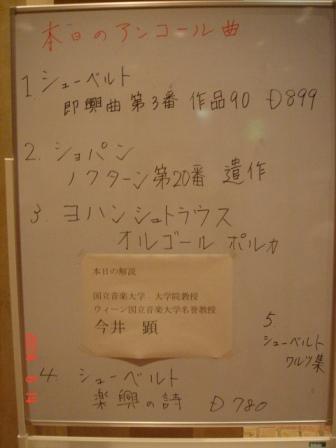 パウル・バドゥラ=スコダ ピアノコンサート(日本ラストコンサート) 日時:2014年6月14日(土)18:30開演 場所:坂東市民音楽ホール 曲目:ショパン/ワルツ第3番 イ短調 Op.34-2 第7番 嬰ハ短調 Op.64-2 第6番 変ニ長調 Op.64-1 ショパン/ノクターン第7番 嬰ハ短調 Op.27-1 第8番 変ニ長調 Op.27-2 ショパン/4つのマズルカ Op.30 第18番 ハ短調/第19番 ロ短調 /第20番 変ニ長調/第21番 嬰ハ短調 ショパン/舟歌 嬰ヘ長調 Op.60 シューベルト/ピアノソナタ第21番変ロ長調 D960 演奏:パウル・バドゥラ=スコダ 86歳のパウル・バドゥラ=スコダが最後の来日公演8回の最後を我が家の近くのホールで行うというので、初見参の坂東市民音楽ホールです。最近ただでさえ備忘録になっている拙ブログ、それに普段ピアノを苦手にしていて、知らない曲ばかりなのですが、スコダが選定したベーゼンドルファーが入っているということで、個人的には(このホールではアシケナージュが選定したという)スタインウエイより好きなので行ってきました。 704席のシューボックススタイル、できて20年を超えるホールはほぼ満席でした。席は中央、やや後ろ。なんとなく周りが静かでなく、目を閉じて聴いていたのですが、ノクターンは音が切れ間無く演奏され、柔らかい音色とともにとても心地良いものでした。 ノクターンのあと、スコダがマイクを持って(通訳・今井顕教授)マズルカについての説明。故郷を追われたこと、内面的な音楽、だったかな。第21番の一番最後を弾いて、「これが終わったら拍手を」と言って会場を笑わせていた。なるほど、曲は今のわたしの気分にぴったりの、晴れでもなく曇りでもなく、演奏は子犬のワルツのときのようにポロポロやることもなく、はらりはらりと優しく進みます。 再びマイクで舟歌の説明。斬新な和声は当時の聴衆に受け入れられたとは言えず、書き直しを勧められたとも。でも聴いてみると、ところどころにぱぁっと開けるような明るい、そして(曲の他の部分と比べて)新しい旋律があって、この夜一番のお気に入りとなりました。私の席がちょうど鍵盤の目の前ということもあって、集中力が高まってきた前半の後半は目を見開いて聴いていたのですが、クロスするのを含めて鮮やかな手さばき指さばきにも見とれてしまいました。 後半はシューベルト。これだけはWikiで事前学習してあって、生涯最後のソナタで、ソナタだけれども4楽章構成、第1楽章は循環、第4楽章は繰り返さないことだけ頭に入れて聴きました。でもこれだけでも、「ああこれが第一主題、第二主題」「アンダンテ、スケルツォ、まるで古典の交響曲のよう」「終楽章、どう高まっていくか、ここからコーダかな」という感じで曲の構成が見えます。後半がかっちりしたシューベルトということで、前半のショパンとの対比もバッチリです。この点、ハイドン・モーツアルト・ベートーヴェンというウィーン古典派ばかりのAプロより楽しかったかもしれません。ただしお馴染みのメロディというわけではないので、聴衆も第2楽章あたりからパンフを触り、足を組み替え、座り直し、なんとなくソワソワ。 アンコールが演奏されます。それが、次から次へと。シューベルト/即興曲第3曲D899、ショパン/ノクターン嬰ハ短調第20番遺作、ヨハン=シュトラウス2世(ユリウス・シュルホフ編曲)/オルゴール・ポルカ、シューベルト/楽興の時第3番へ短調D780、シューベルト/ワルツ、計5曲。ホワイトボードの書き方が、予定外の多い曲だったことを示しています。 スコダの演奏を聴くことはもう無いと思うけれど、こういうコンサートだったら聴いてもいいなと思えたピアノリサイタルでした。