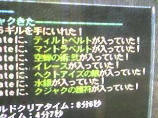 ブログで知り合ったSoukさんとフレンド登録させて頂いてから、ちょくちょくサーチコメントを見る(よく/sea All friendをやるため)のですが、この日、ログインして、サチコメを見てみると、光る眼を募集してました。お暇だったので、声をかけてみました。 Tadi:光る眼、助け必要ですか? Souk:丁度いま、声をかけようと思ったんですw ※わかりやすいように表示と違う表現してます。ここにガル忍コンビ結成!もう一人、ボスをマラソンをするために、赤か獣が必要だったので、 Tadi:獣だと、マラソン楽ですよ Souk:赤さん確保しましたで、急いで合流してみると、赤さんの種族はガルカじゃなくてミスラ。ガルカ3連星にはなりませんでしたが、シッポ同盟(勝手に命名)結成ですw早速、移動し、順番を決めて、突撃。順番は、1番Soukさん、2番赤猫さん、3番私。ダイスで大きい順にしたのですが、/randomで見事60という数字を出して、最後になりました。運を残す為に、小さい数字を出したと思えば、最後でもへっちゃらです。赤さんがマラソンのコースを知らなかったようで、円の中をぐるぐるとまわってたので、ガに巻き込まれそうになったりと危険な場面ありましたが、なんとかしのいで、1戦目勝利。2戦目は....問題なし。あっさり撃破。もちろん、3戦目も問題ありません。ドロップは、前のふたりがハズレてたので、あまり期待はしてなかったのですが、こんなの出ちゃいました。通算2度目となるクジャクの護符ゲット!しかも、空蝉の術:弐とイレースまで出て大当たりです。これで財布少し潤いました。潤ったといっても、クジャクの護符は売りませんよ。装備用として、大切にさせて頂きます。・・・・これで心置きなくワラーラターバン装備できるな。