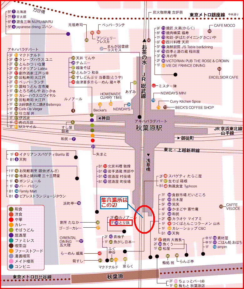 やっと全員に連絡取れました。ということで、詳細をご連絡。[2007年新年オフ会] ・日程: 2007年1月20日(土) ・時間: (集合)18:00 (開始)18:30~ ・場所: (集合)秋葉原駅 昭和通り口 ※目印は■e公認のリアルガルカw 怪しい?人達が固まってるで、わかると思います。 (宴会)とり鉄 秋葉原昭和通り店(TEL.03-5289-7788) コースで4000円(飲み放題付き)を予約してます。 ・参加予定者(9人): LS内:Nene(ガルカ)、Paffendorf(ガルカ)、Gaw(人)、Moomin(ガルカ)、Tadi妻(タル)、Tadi夫(ガルカ) LS外:G氏(ガルカ)+他2名(???) ・連絡先 Tadi携帯メアド ・大事なお知らせ: 今回、新顔(ガルカ)が大目ですが、みなさん仲良くお願いします(笑) また、LS外からも参加しますので、これを気にサーバ内での つながりを増やす機会にしてほしいです。 急遽、欠席する場合は、1日前までにお願いします。何かありましたら、レスお願い致します。