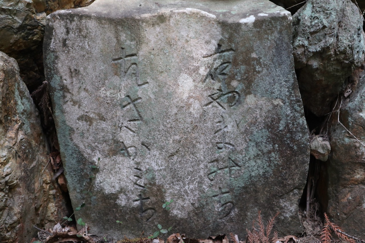 分かれ道の角に建っている祠の前に「右やまみち 左さかみち」と彫られた石が立っています。どちらに行っても山道だし、坂道なのにね(笑)。これをわざわざ彫った人は何を思っていたのかしら?? うーん、おかしいぞ。