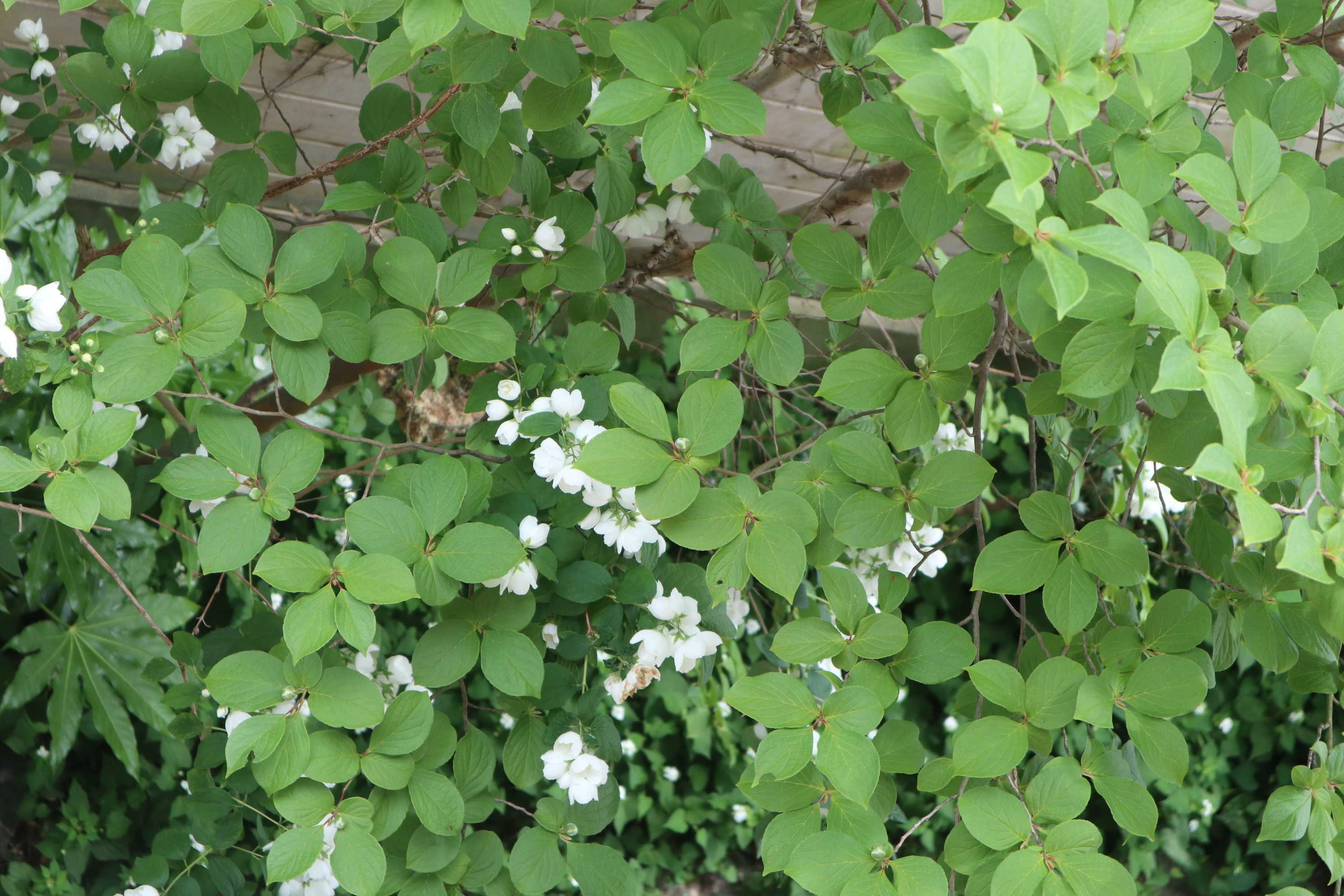 2階から撮った梅花空木。下にさらに小さく白く写っているのがドクダミです。白い花だけで嬉しい! もう少ししたら「シャラ」が咲きます。こちらも白ですよ。