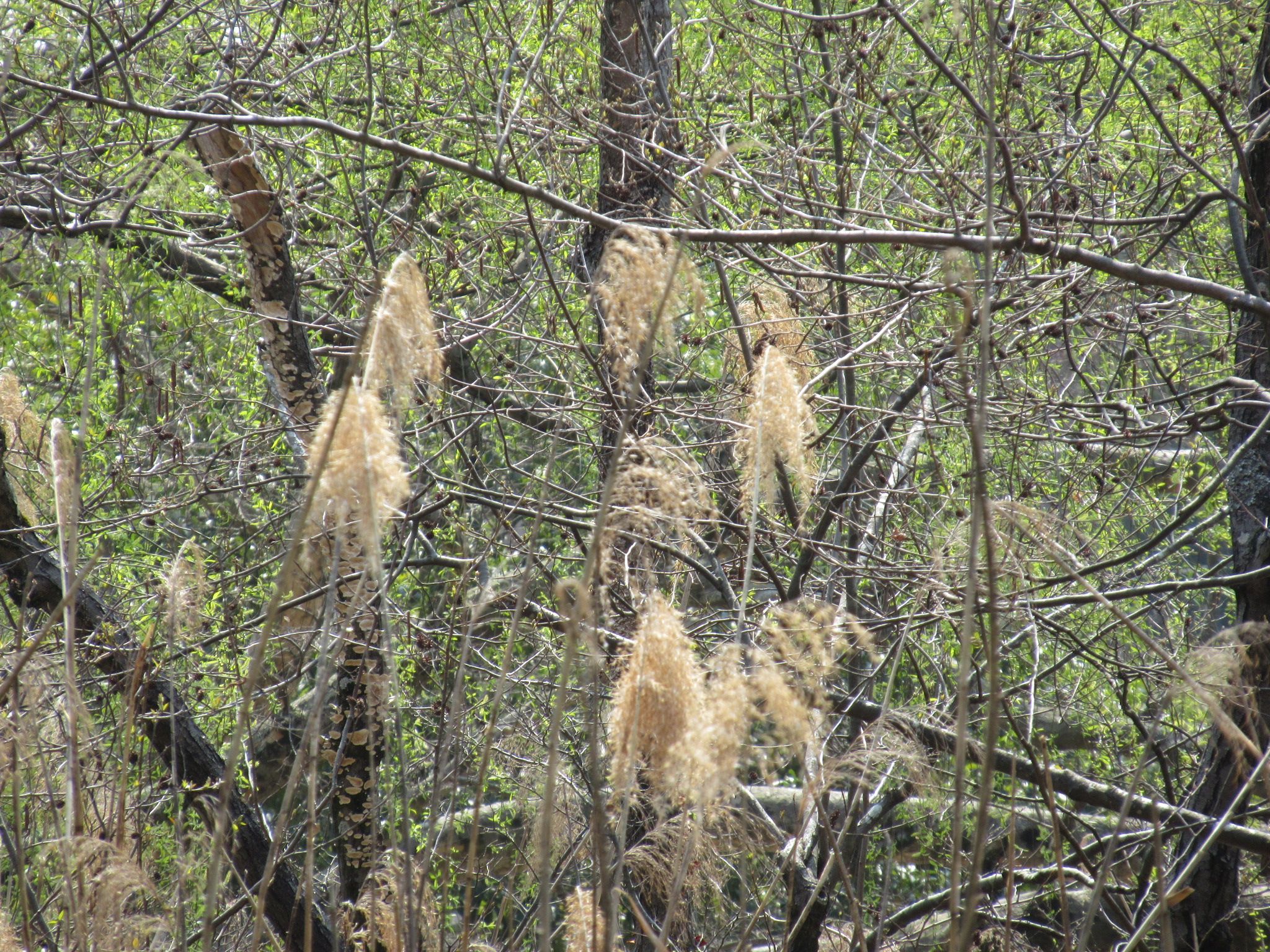 水面から出たガマの枯れ葉と中之島に群生する柳の芽吹きが対照的である。