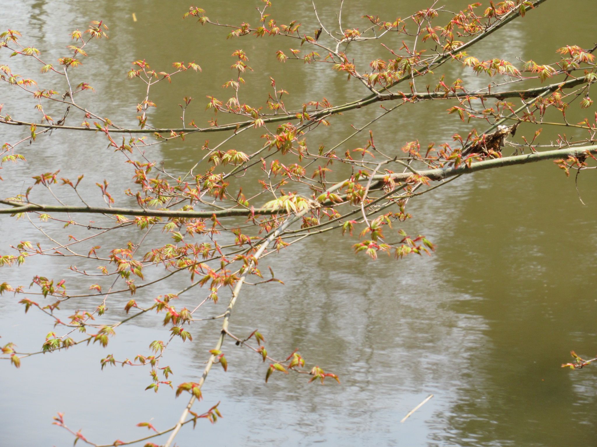 水面に垂れ下がったモミジもかなり芽吹いてきている。
