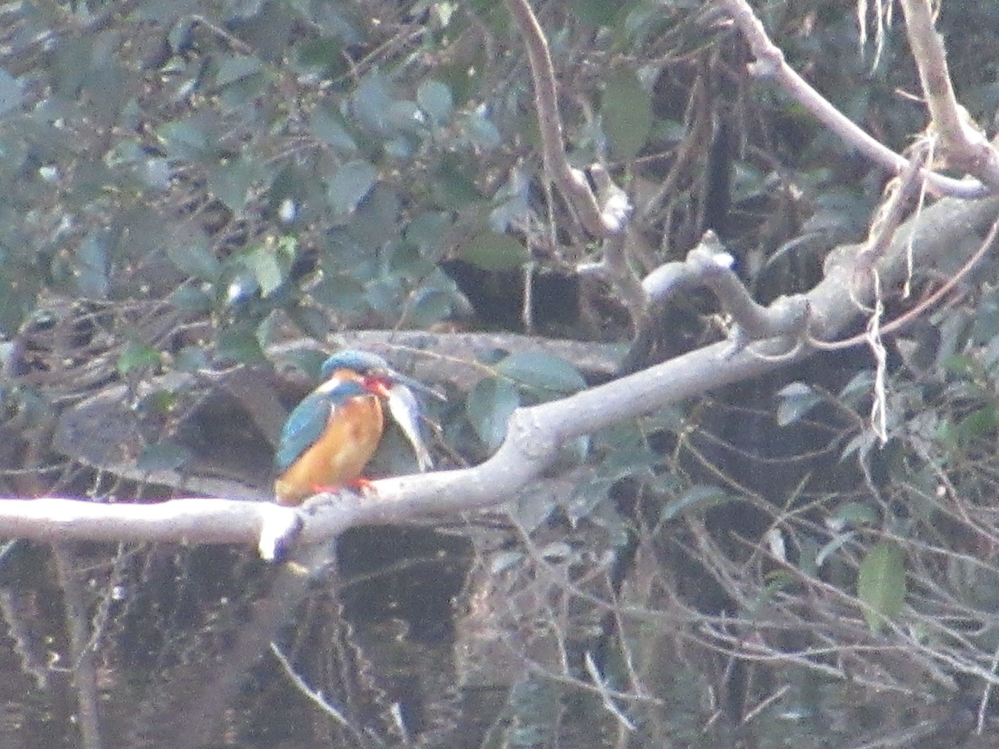 見ると一匹のカワセミが対岸まで水面を渡って飛んで行き小枝にとまった。