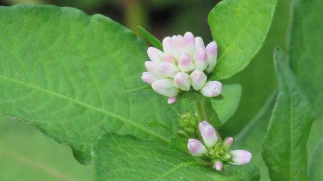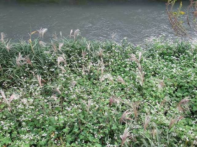 毎日の散歩道の川岸に小さな白い花を持つ雑草が生え茂っている。