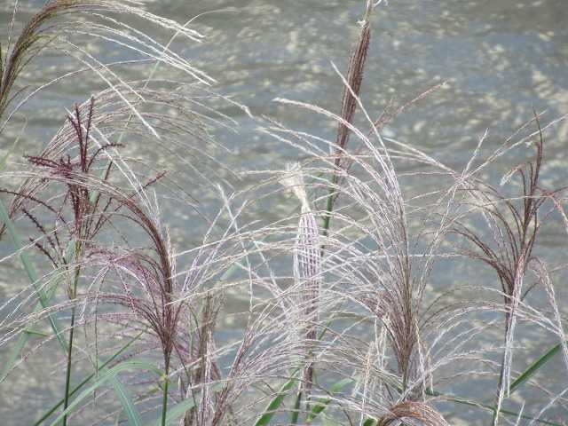 揺れ動く川面と首を垂れる寸前の薄が季節感を漂わせる。
