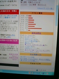 昨年、9月1日に楽天広場のブログを始めました。 そして、ついに本日で1周年を迎えることができました。最初は何をしていいのか分からず始めました。アフェリエイトにも興味を持ちました。ライブドアにもブログを11月から始めました。現在タイトルには全中バレーについて【プレハブ通信】、プロ野球について【評論家生活】、子供の野球について【ダッグアウト】、株式投資について【無印ファンド】、サッカーについて【プラーベートビュー】、ラーメンを中心とする麺類について【拉麺MAN】、食事・宴会について【大食い】、北朝鮮・南アフリカ・中国の旅行記、日常の出来事など ブログランキング【バレーボール部門】では最高3位になったこともあるし(ありがとうございます)1日のアクセスが(最高)1927 (全中バレー終了後の8月26日)を記録しました。写真は8月12日この写真は8月26日のアクセス数【1927】 今後ともよろしく。人気blogランキングへ