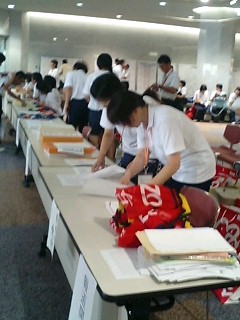 8月19日(土)朝から体がしんどい 動かない その体にむち打って、プレハブへ 11:00もうだめだ 寝る 最近、またふとんで寝たことがない 24:00過ぎに帰って夕食?(夜食?)して25:00にTVを視ながら寝ている いつの間にか朝だ 朝か・・・ 12:00復活 準備開始 何の準備かって 14:00から最終の全体会です 13:30・・・K中学校に到着。14:00全体会。 まずは全体説明。次に、USJからいただいた(「競技役員・生徒役員への慰労に」といって頼んでもらいました)を配布 喜んでもらえましたでしょうか14:30 広告主へプログラムを送る準備をして16:10 各部門別に話し合い、17:10各会場で話し合い、 18:00主任会19:00プレハブに帰ってきました。それから、主に私のとってきた広告主さんへプログラムを配布する準備をしました。22:00KTR理事長が来て、話しをして 【剣道】【バドミントン】【新体操】の様子を聞いて帰宅の準備。 バレーもいよいよ、22日に開幕 TVのバレーもいいけど中学生の熱い戦いがもっといいと思うよ人気blogランキングへ